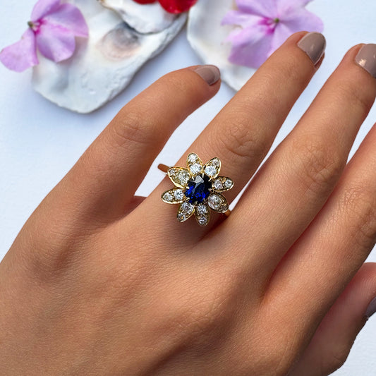 Antique 1ct Sapphire & 1.25ct Diamond Floral Cluster Ring