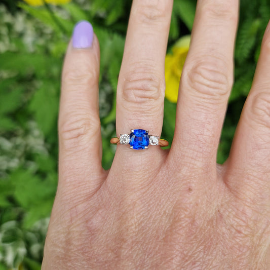 Vintage 1.2ct Cushion Cut Sapphire & Diamond Trilogy Ring