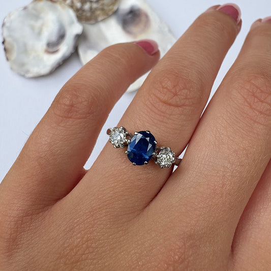 Vintage Platinum 1.50ct Sapphire & 0.30ct Diamond Trilogy Ring