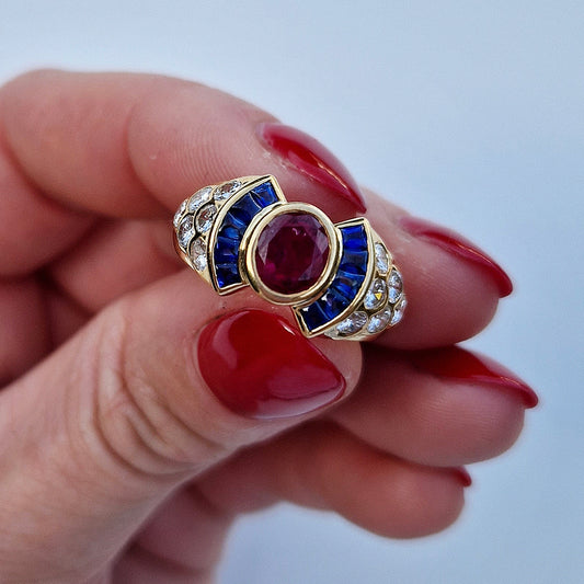 Art Deco Vintage Ruby, Sapphire & Diamond Ring