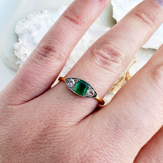 Antique Emerald & Diamond Three Stone Boat Ring