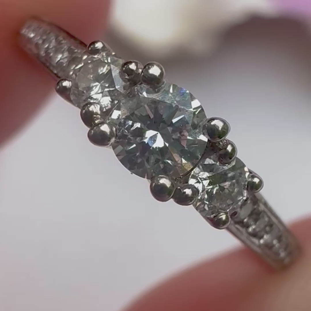 A gorgeous Diamond Trilogy engagement ring with 3x Brilliant Cut Diamonds holding lovely colour and clarity, cushioned by 12x Brilliant Cut Diamonds set across the two shoulders. Set on a 9ct White Gold band.