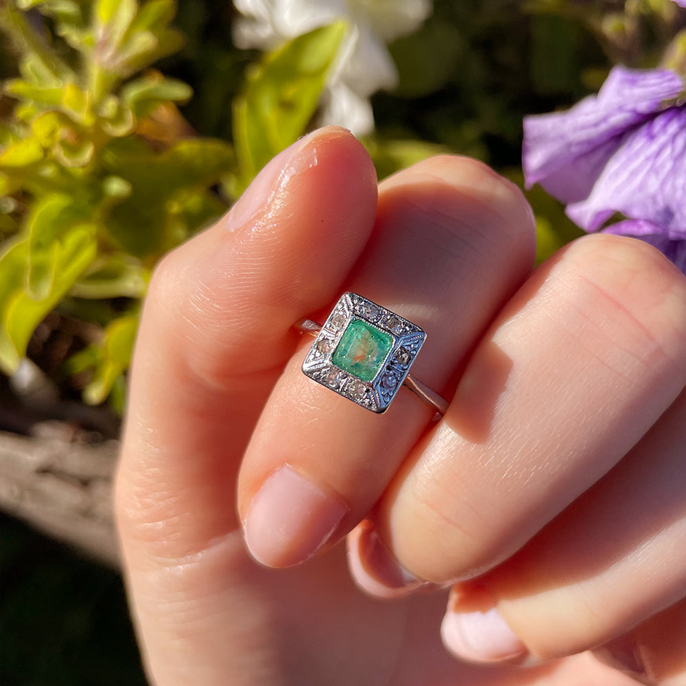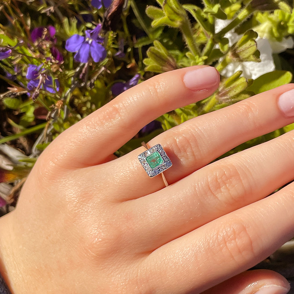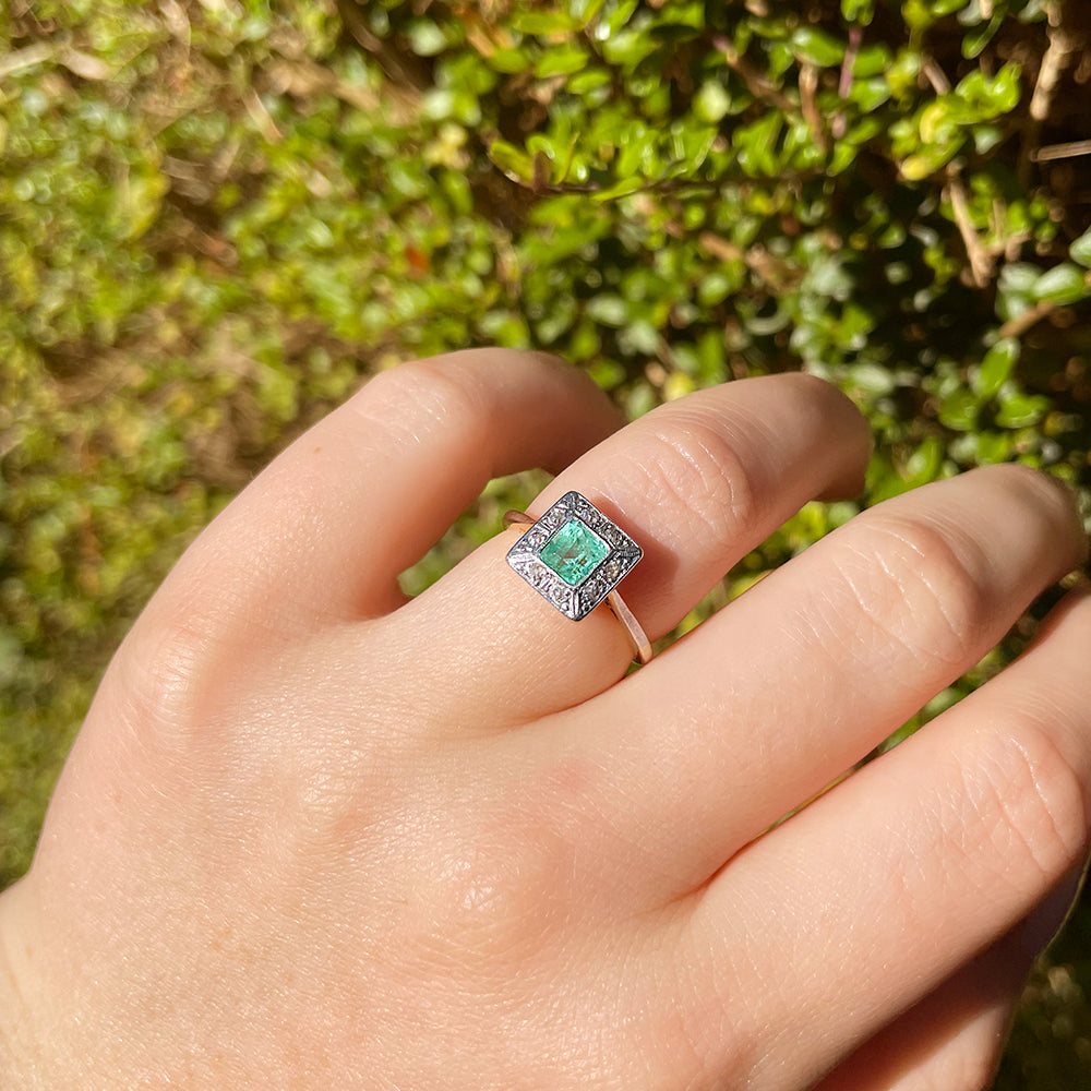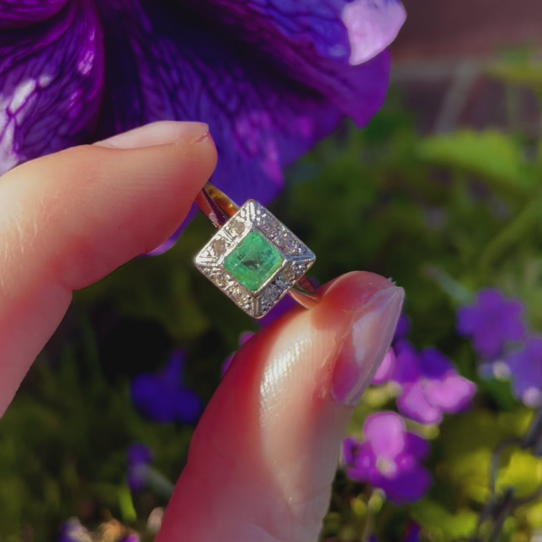 A beautiful Antique Emerald and Diamond Cluster ring with an enchanting Princess Cut Emerald, surrounded by 8x Old European Cut Diamonds. All set on 18ct Yellow Gold and Platinum.