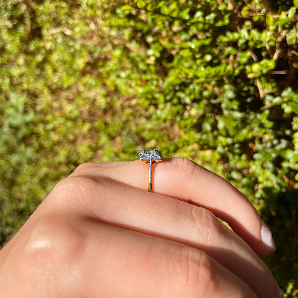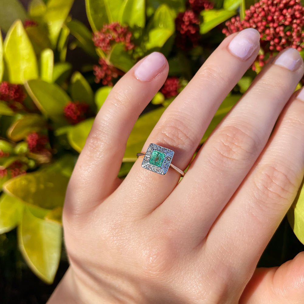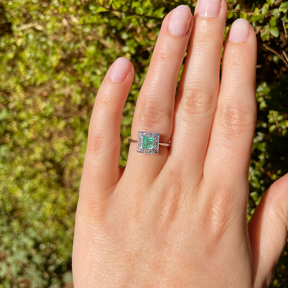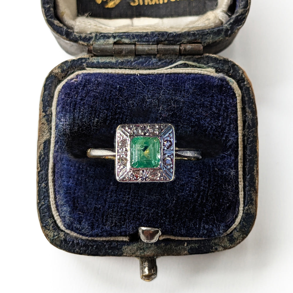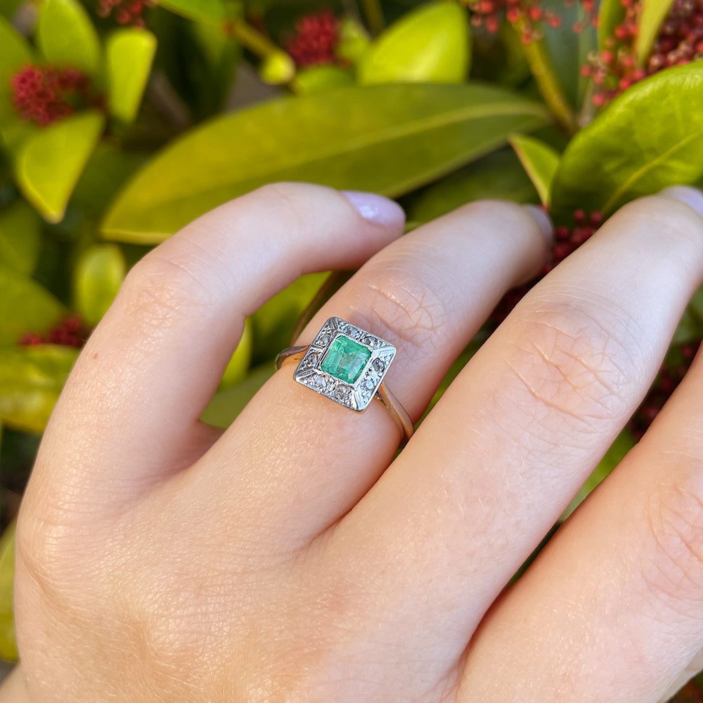 A beautiful Antique Emerald and Diamond Cluster ring with an enchanting Princess Cut Emerald, surrounded by 8x Old European Cut Diamonds. All set on 18ct Yellow Gold and Platinum.