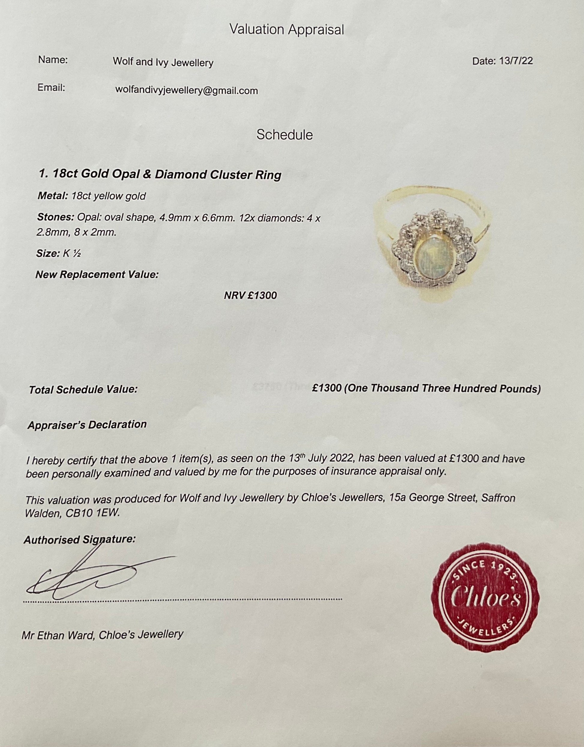A beautiful Opal & Diamond Cluster Engagement Ring. A bezel set Opal full of colour, surrounded by 12x Brilliant Cut Diamonds set in 18ct Yellow Gold. Full British hallmarks from London 1988.