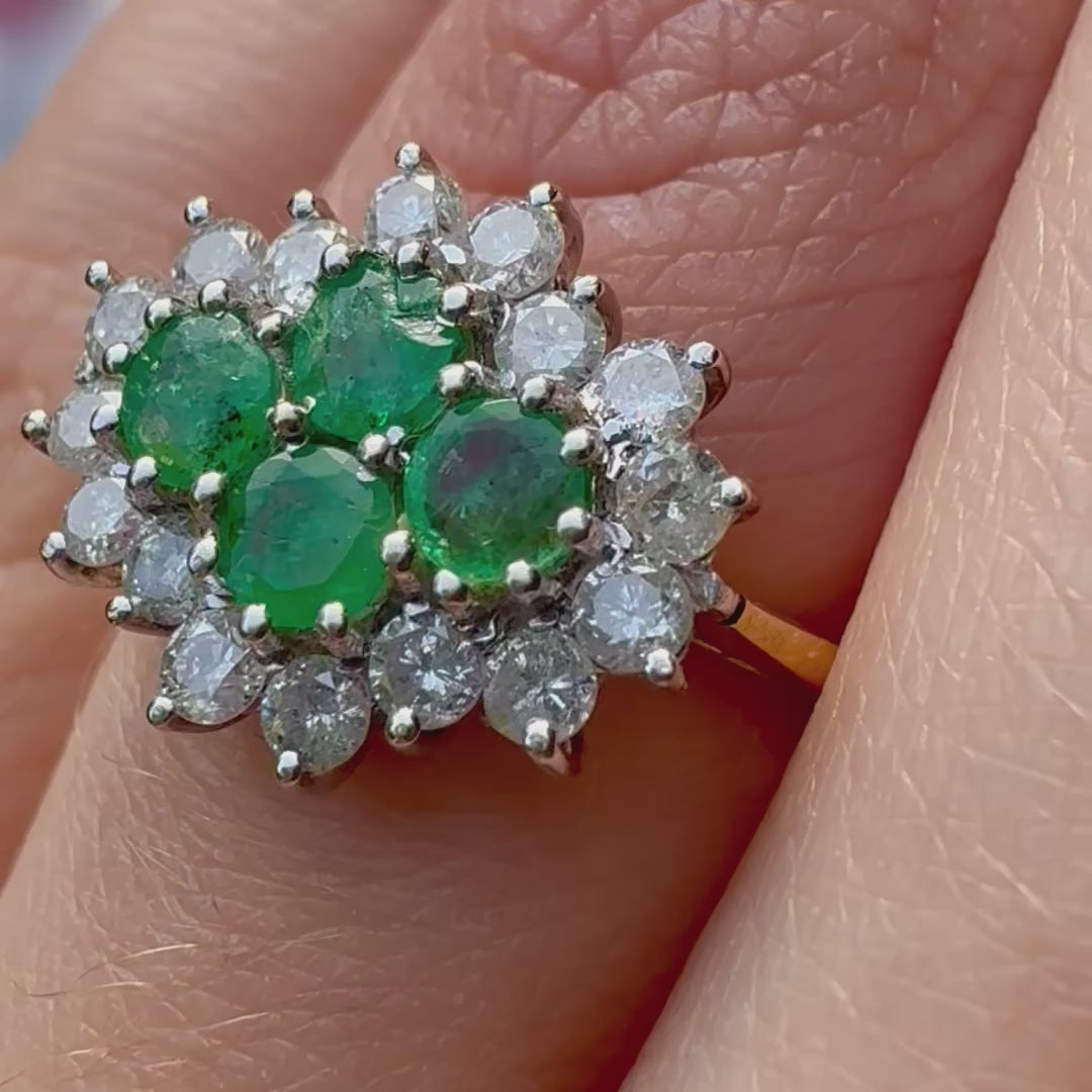 A gorgeous Emerald & Diamond Cluster - a cluster of 4x stunning Round Cut Emeralds, with a total weight of 1.00 carat, surrounded by an outer cluster of 16x Brilliant Cut Diamonds. All set on 18ct Yellow Gold.