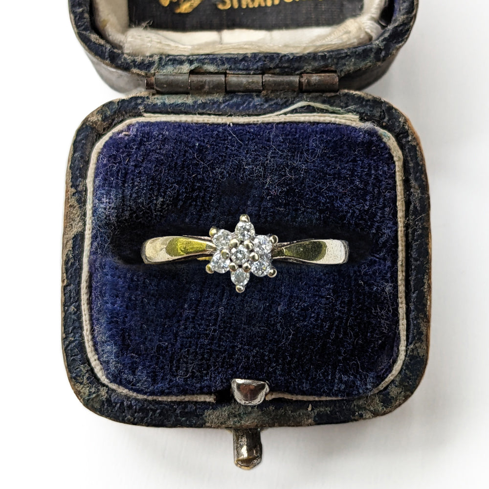 A dainty little Diamond Floral Cluster Ring, holding 7x Brilliant Cut Diamonds, all set on 9ct Yellow Gold. Easily resizable for just £25.