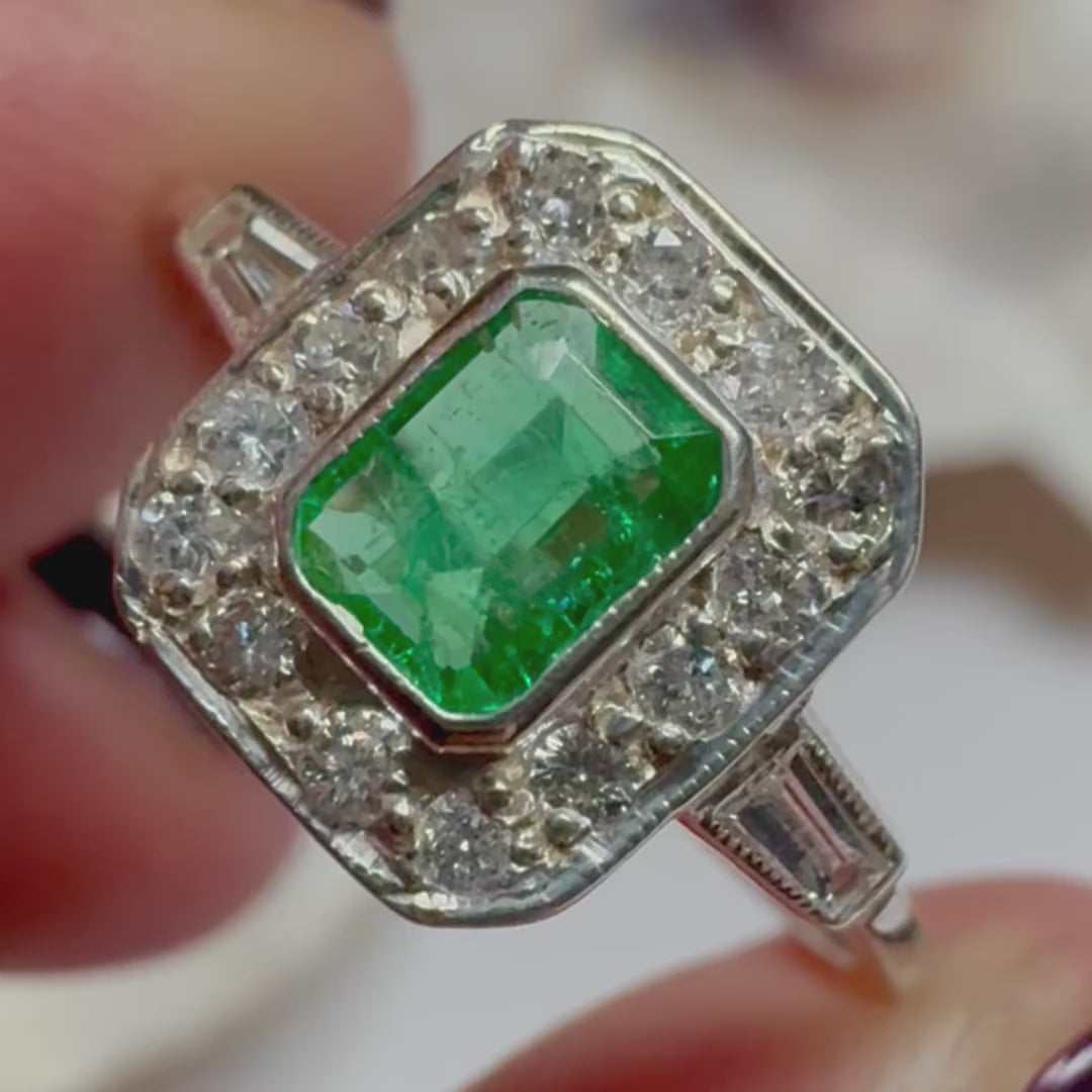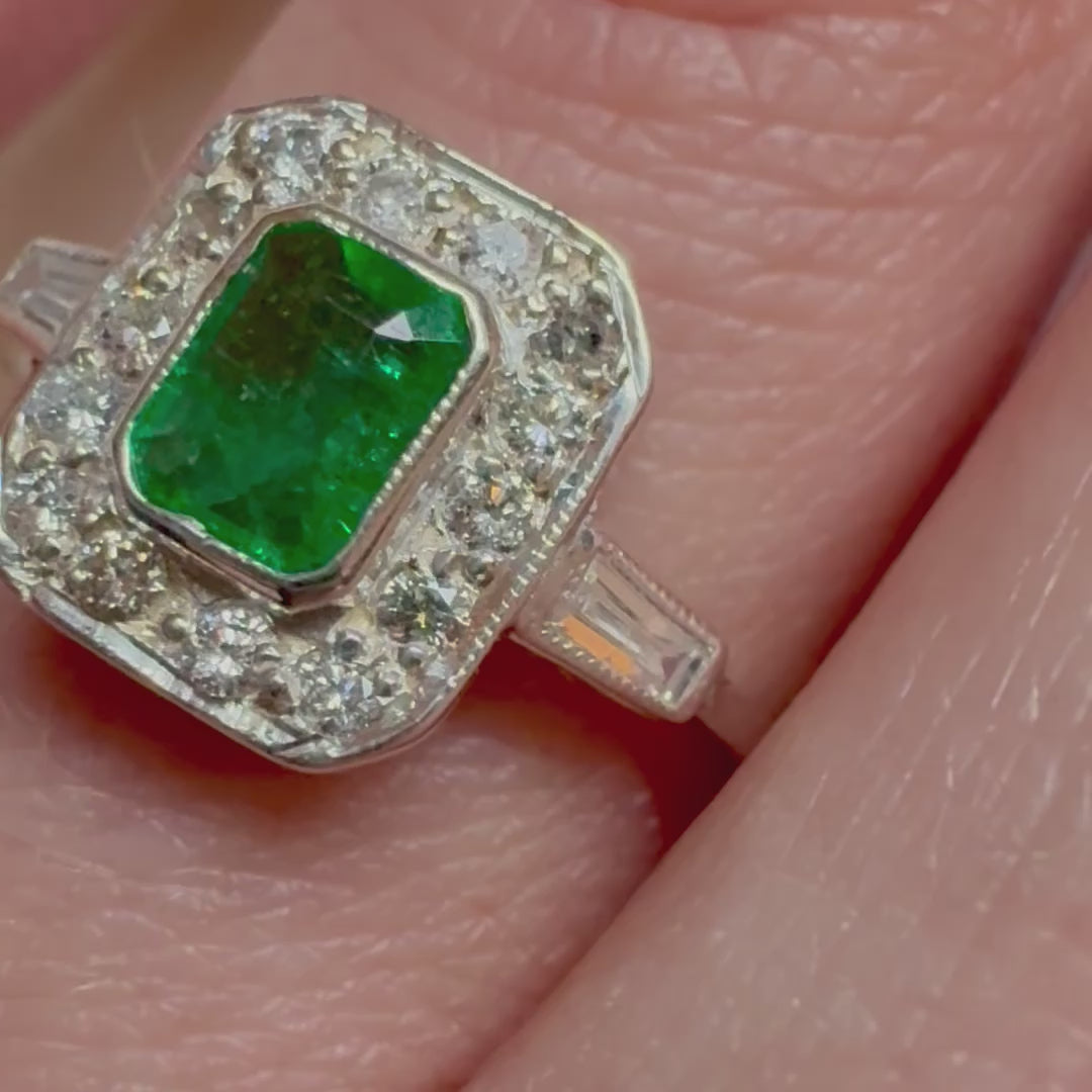 A gorgeous Emerald & Diamond Cluster with a striking Emerald Cut Emerald, surrounded by a cluster of 14x Brilliant Cut Diamonds and 2x Tapered Baguette Cut Diamonds on the shoulders. All set on 9ct White Gold.