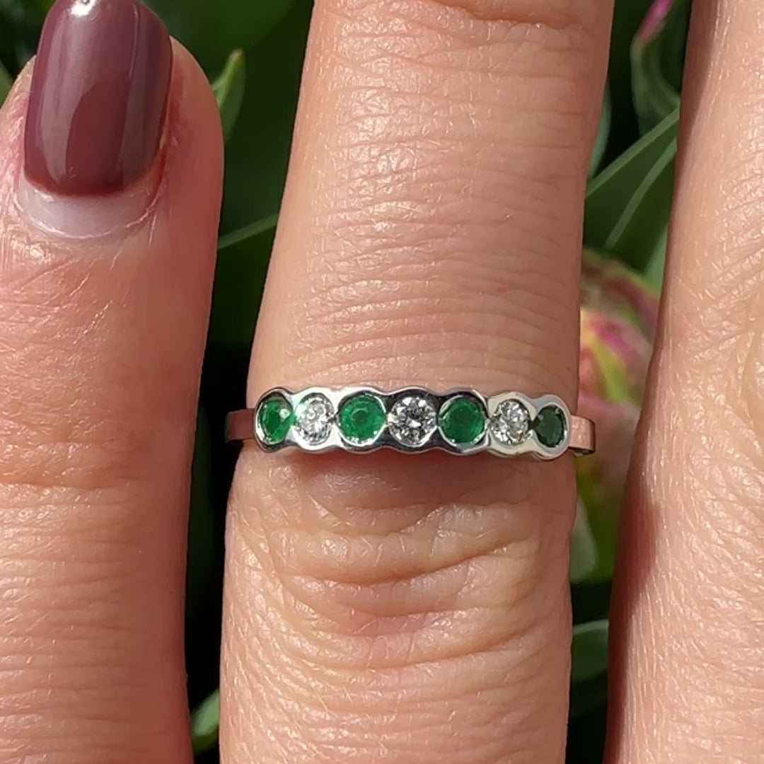 A sweet little Half Eternity Band Ring, lovely for stacking with other rings. 4x Round Cut Emeralds and 3x Brilliant Cut Diamonds, all set on 18ct White Gold.